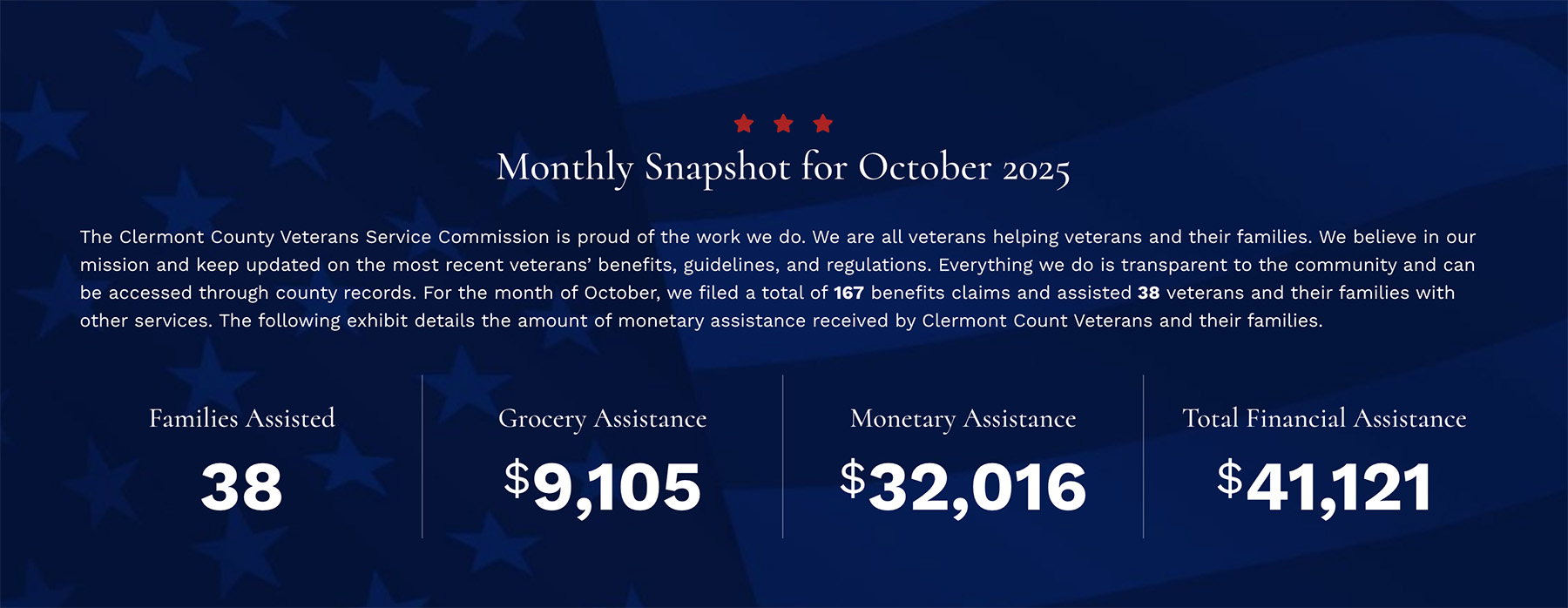 Each month, up-to-date statistics are posted on the homepage that reflect families served and monetary assistance given, showing the real impact Clermont County Veterans Services has on their local community.