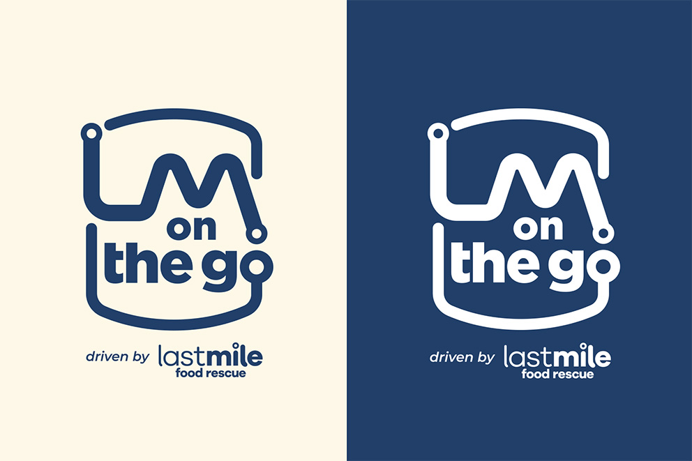 The "Last Mile on the Go" program is Last Mile's repack initiative that focuses on repackaging rescued food for easy distribution. The logo mark used items representing food packaging or movement as inspiration, with the chosen design being a shape inspired by a 3-dimensional outline of a can.