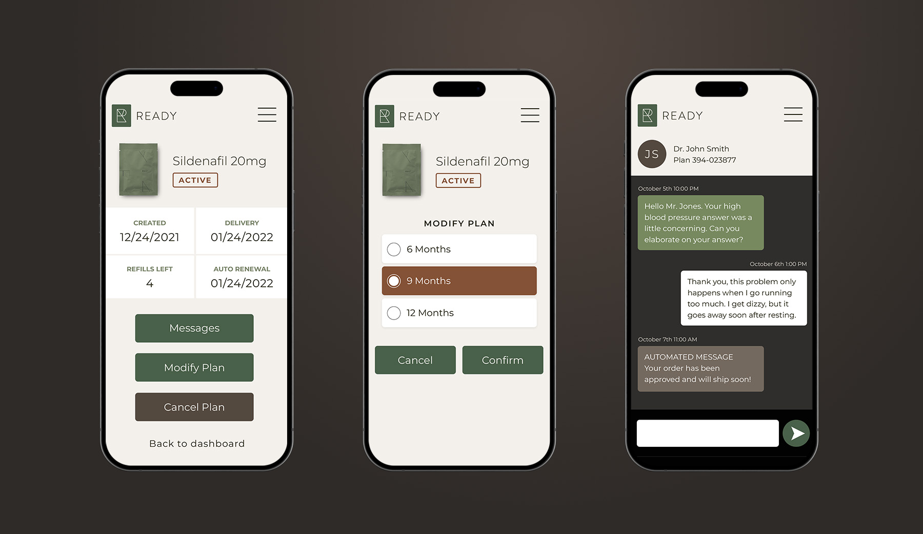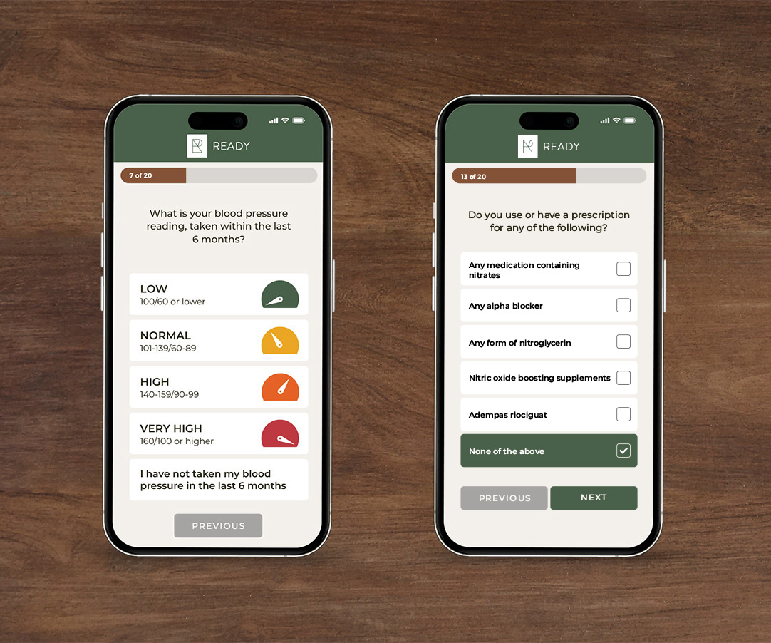 Ready is about getting back to enjoying life again, without worrying about ED. Emphasizing the simplicity of the process was essential to a frictionless experience: a few questions, a quick consult, select your plan, then your medication is delivered discreetly to your door.
