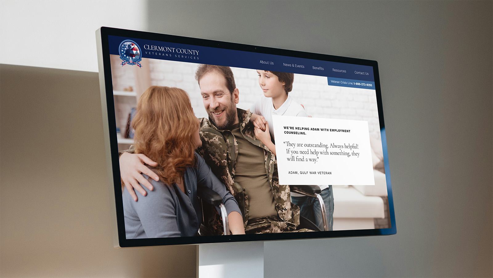 Idea: Tap into the visual power of military iconography and the impact of authentic veteran stories to celebrate vets and convey that CCVSC is here to proudly serve them. The site we designed both informs visitors and immerse them in the brand’s mission from the start. The main message, “You answered the call. Now it’s our turn.” clearly conveys that CCVSC exists to support Clermont County’s veterans.