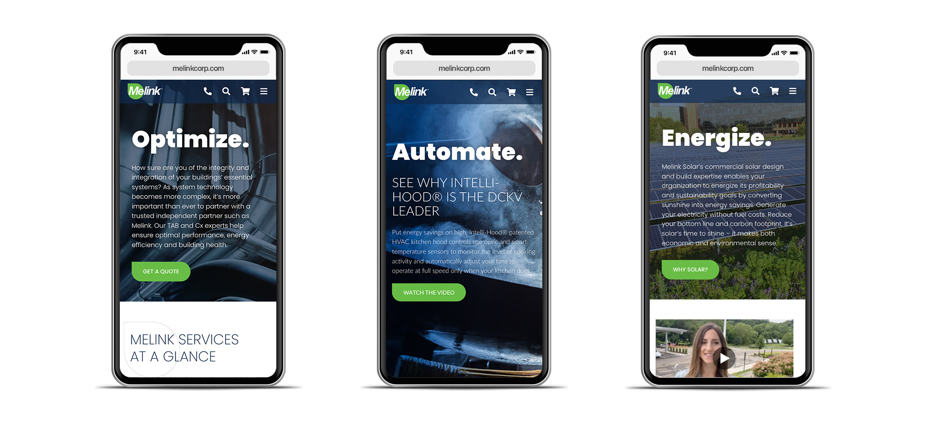 Ideas: Melink’s energy solutions serve multiple audiences, so a primary objective was to create an overarching concept big enough to be empowering while being audience-agnostic. With energy efficiency as the underpin across all verticals, the result was "Every building has the power to change the world." Smoother navigation was a priority. Previously siloed by business unit, there was no direct way to navigate to another unit or clear understanding of how they work together. The new site would bring all of their business units together in a unifying experience.