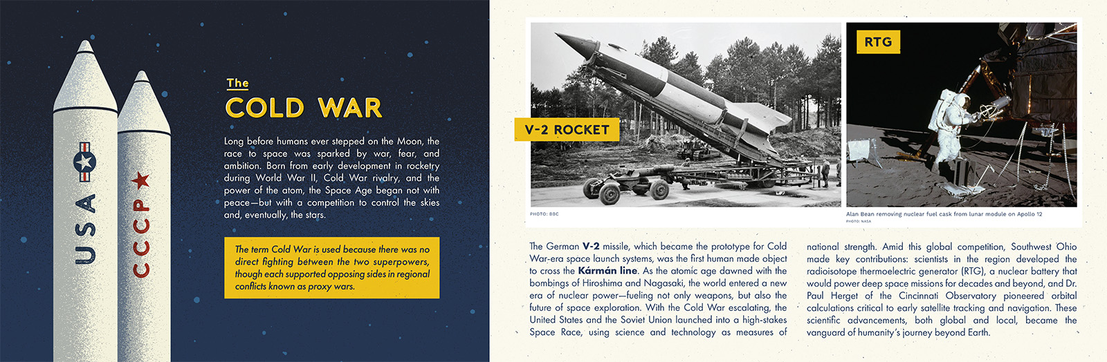 The graphic style of the exhibit was inspired by poster art from the atomic age and the space race, an optimistic and forward-looking period when humans dreamed of traveling among the stars and competed to see who could get there first. Custom illustrations of vehicles, astronauts and more give the exhibit a unique look and personality.