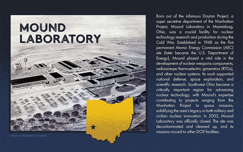 One of the important achievements highlighted by the exhibit is the development of the Radioisotope Thermoelectric Generator (RTG), developed at the Mound Laboratory near Dayton, Ohio. The RTG is a power source that uses thermocouples to directly convert the heat from radioactive decay into electricity, providing decades of reliable energy where solar cells won't work. The Voyager spacecraft, launched in 1977 and still sending back information from beyond our solar system to this day, are powered by RTGs.