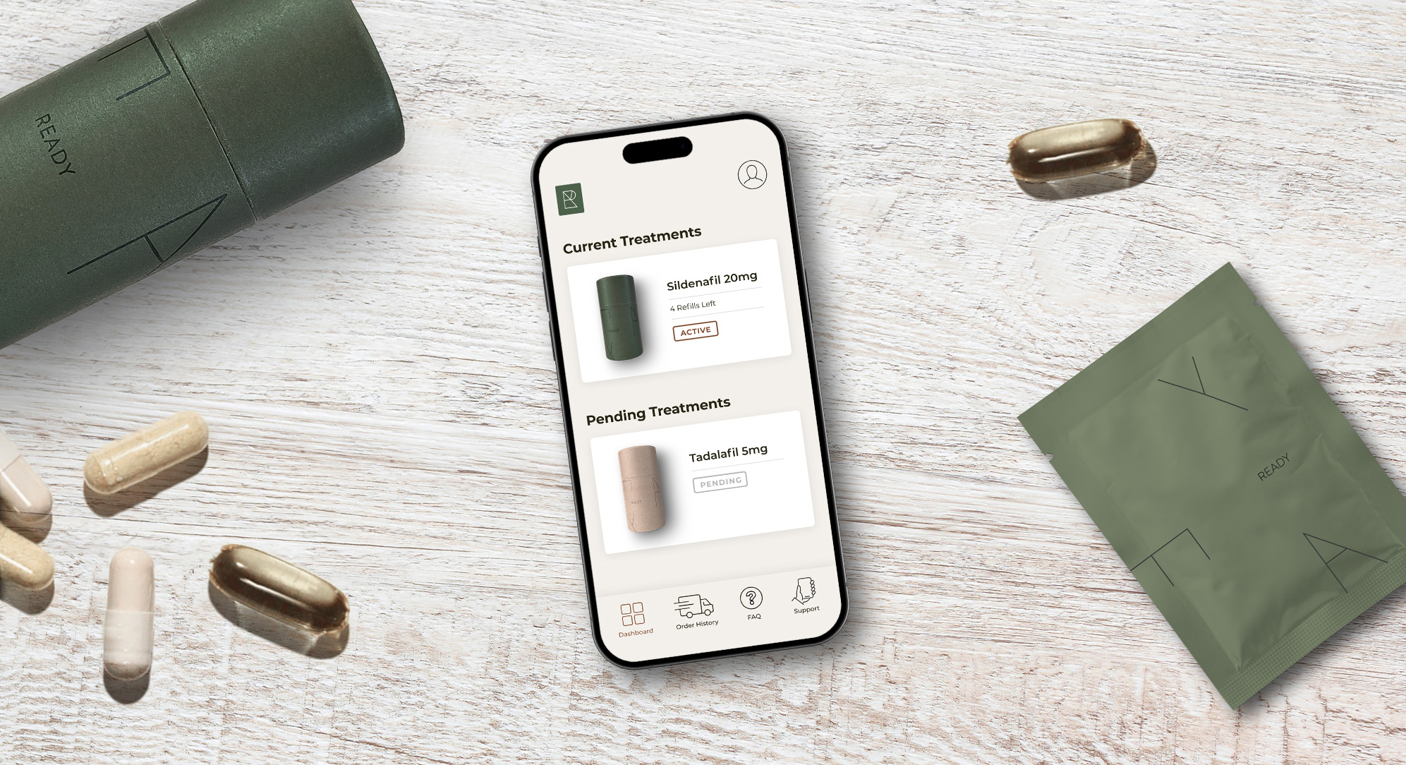 Idea: The patient portal app is simple and would only feature essential functionality to manage your treatments, orders, and personal info. Leading up to engagement with the mobile app, the website's aim was to communicate the simple yet discreet process of getting ED medications through Ready, and to convince them that getting treatment was easier than they might think.